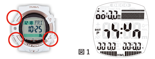時計モードを表示している時に[ADJUSTボタン]を押しながら、[MODEボタン]と[PLANボタン]を3点同時に押すと「図1」の画面が表示されます。
